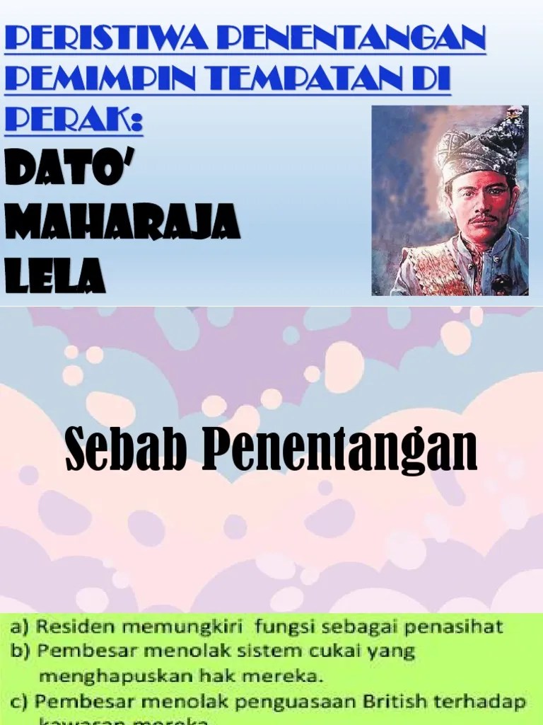 Dato' maharaja lela · perjuangan dato maharajalela di perak · faktor penentangan j.w.w birch · peristiwa penentangan · kesan penentangan.